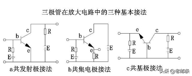 放大电路的三种组态分为共基,共集,共射三种组态。放大电路里通常是晶体三极管、场效应管、集成运算放大器等,这些器件也称为有源器件。放大电路的三种组态判别以输入、输出信号的位置为判断依据:信号由基极输入,集电极输出——共射极放大电路;信号由基极输入,发射极输出——共集电极放大电路;信号由发射极输入,集电极输出——共基极电路。