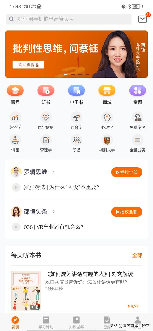 最初了解得到应该是几年前了,看了罗胖的罗辑思维,上了贼船。得到上面人文社科管理经济类的大佬很多,课程偏贵,质量也很有保障。