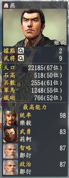 君主:姬职创造性:保守君主士道:才(黄金台,我来了!)专属政策:合纵之策苏秦,你真的要这样子做?苏秦插手说,当然,我可是五国相印的男人呀姬职身在寒冷的北方,没有了南边喧哗的争斗声倒是可以静下来听个小曲慢慢发展,他的北边除了慕容家的铁骑和辽国的猛将虎视眈眈,基本也没有什么大的威胁,可以慢慢借着苏秦搞搞外交啦。军事实力上面有个攻城狂人乐毅,还有一个小弟秦开,推城速度那是棒棒哒,但是回头再看,就没什么厉害的军事将领了。不过不怕,姬职的周围也没有什么厉害的对手嘛,除了老对手田单在山的那边等着他,嘿嘿。