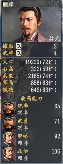 君主:韩武创造性:保守(我那抑郁的眼神已经表明了我在七国介么弱~)君主士道:家专属政策:劲弩韩出射射射,感谢申不害大人给我韩国一个机会啊,韩武做梦口吃喊到。战国七雄都登场这是很正常的事情,但是像韩武这样弱得可怜的真是罕见啊,韩武的眼神真的很压抑很压抑全势力4个武将两座城,韩武说我到底肿么守啊还好有一个申不害帮帮忙,但是西边的晋和秦,东面的楚,以及下面有点潜力的吴国都在瞧着呢。