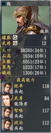 君主:魏斯创造性:中道君主士道:家专属政策:武卒制都带着这个政策了,吴起你不要离开我,让我永远牵着你!魏斯这天喝完酒非常高兴,在战国七雄里面自己的城池数量这么多真是太兴奋了,而且最让魏斯兴奋的是,吴起老师在自己这里,这下好了,魏斯把所有的事情交给吴起去办吧,打仗是吴老师,种田是吴老师,搞建设还是吴老师,吴老师累个不停呀。除了吴老师魏国还有几个很厉害的人物,一个是李悝,李悝见吴老师太辛苦直接带着特技上来对吴老师说:虽然你的政治比我高点,但是我的特技说不定能帮你一点忙,魏无忌也是这样子的一个人物,拥有名士的四公子之一干起活来也是很快的,这样吴老师终于能专注打仗了咦,好像混进了什么龙阳君,辣眼睛辣眼睛。