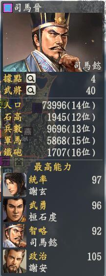 君主:司马懿创造性:保守君主士道:才(话说司马睿,也就是牛睿同志真的真的很想把他拿出来啊,然而我们的司马懿同志好歹比后面的孙辈聪明厉害,万一牛睿同学带着桓温、谢安、刘牢之来教育老爷爷这样画面就不太好了吧)专属政策:士族主政,反正点开司马势力一看武将都是那几个姓,敢情真是好好滴。终于到了司马家族了,看了看司马家的人真的是人多啊,不过基本上也就是那几个家族再互相比拼谁的名字很好看吧。问题在于司马家的人呢,论帅气还是有的,但是论水平和能力呢,就少有几个拿的出手了,当然了,毕竟还有桓温撑起一片天地,但是桓温喜欢照镜子,他觉得自己不够帅脸就红了,于是他的忠诚也跟着红了,桓温一红脸,桓玄自然也随着红脸啦,于是我们一家就这样子随时被别人的美容品抽走了。再看看谢家,人称谢玄宝树帅哥,因为长得太帅,所以人也比较不错,和桓温也算得上一片天地了,而且还有一个老头子叫做谢安的坐在后方远程奶爸,另外部下刘牢之也算是一个单体冲杀的狂人,三个人凑齐一队之后,可以远处悄悄打枪,也可以不要命地冲过去和别人戏耍,还可以随时奶队友,也算是个不错的组合。另外再有就是王导和庾亮两个种田不错的人,以及还有闻鸡起舞的祖逖和刘琨。西晋不服,居然不说我们,好吧,你们也就羊祜杜预和苟晞可以拿出来说说,就不要多说什么了吧。什么,你问我贾南风?我觉得她呀,嘿嘿嘿肯定得等到立志传有婚姻功能才加上是不是~以上就是我的回答,个人一直关注策略单机游戏的动态,欢迎大家添加关注与我互动,也非常欢迎大家到牧羊游戏网mygame123.com了解更多策略游戏的消息,再次感谢邀请!