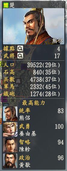 君主:熊侣创造性:创造(你们总说我是左衽左衽啥的,我不听我不听,就不要)君主士道:志专属政策:尚武安邦墨言君起得名字就是说呢,楚人打仗比较厉害嘿嘿,其实我更倾向于问鼎中原,乃们说呢?作为当时南方大国的楚国,熊侣也是比较憋屈,上面肿么多了一个不认识西汉压着自己,还有下面吴越二国也在看着呢,西面的大秦依旧是自己难以抹去的痛,让我的利剑划开那道苍穹的天线,带上我的志向去那中原逐鹿。咳咳,回来回来,楚国在12代苍穹有霸王的鼎力相助很厉害,不过一到多势力的mod就得和霸王挥泪而别了,这次熊侣自己在四国(被我改成了湖南+江西)奋战,不过斗志依旧昂扬,熊侣大人的装备也是非常齐全,自己手握一个全体buff的战法,已经达到了李世民的水平,虽然特技差了一点嘿嘿。然后是熊侣的部下,首先有爱国诗人屈原的帮忙,屈原是一个能文能。。的人,本身就有厉害的文学家特技,现在还带上了一个上级战法,做主将还是副将都是棒棒哒,当然啦,我们的屈原也是灰常适合搞外交滴,总之是个全能人才。另一个就是养由基,这个能四面八方百步穿杨射箭的将军不用多说了,谁用谁知道,记得带上弓箭(铁炮)就好。什么,你说项燕去哪了,哎哟,项燕有事没赶上这戏,只好下一集再见了。