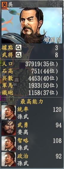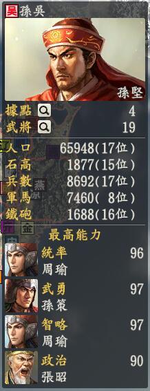 君主:孙坚创造性:保守君主士道:家专属政策:拓荒掠民,墨言你还能再黑一点吗?对比曹魏的赚粮食,蜀汉的赚忠诚,孙吴就是赚钱了。孙吴聚集在南方地区,和曹操是最接近的了,所以两边交兵是迟早的事情,同时和北面的司马家族接壤,这真是当年怎么样,现在也要怎么样应付啊。不过孙吴方面武将不多,主要就靠着周瑜的一把火直接bug伤害,吕蒙、甘宁都比较趋于平衡作战,陆逊也是一个比较厉害的debuff将领,可以和周瑜单独拿出来用,此外单体buff主要就是靠孙策。孙吴的文官大多数都是镇静系列,比如诸葛瑾、顾雍、二张等人,还有一个弓兵(铁炮)系列的强将陆抗,基本就是酱紫的构造了。
