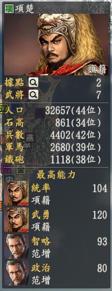 君主:项籍创造性:保守君主士道:家(我可是单纯的楚国贵族血脉!!呀呀呀)专属政策:无什么!我项羽居然没有政策,所以我考虑从刘邦身上割一块肉给项羽做政策,毕竟你爸就是我爸刚才路过的陈胜是什么鬼,怎么就好像天空飞过的小鸟一下子就没了,现在该我霸王登场的时候了。话说上一回,楚国的项燕神秘失踪,他到底去哪里了呢,原来是被项羽偷偷给藏过来了。虽然偷了一个叫做项燕的祖辈,但是这不能阻止霸王尴尬的局面,毕竟现在是月落乌江时候的样纸,不是彭城这块地方呀。但是我们的霸王拥有一个全剧本唯二的特技,这个特技在12、13使人威风丧胆,12代它的名字叫做绝冠天下,13代它的名字叫做绝冠古今,现在,霸王说两个都要了,他既有绝冠天下,又有绝冠古今,冉闵、李存孝、吕布等旧绝冠只好望其项背了。而且我不会告诉你虞姬妹纸究竟有多强,因为虞姬妹纸和霸王一起出去浪的话司马懿分分钟哭到鼻子都酸了。这时候司马懿说:大爷你倒是直接对着刘三来呀。17.西汉