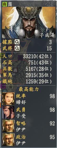 接着夏朝的就是商朝啦君主:子成汤创造性:保守(还是种田去吧,不对其实你们可以玩经商的嘛~)君主士道:名专属政策:卜骨问天本来想做一个商人属性的政策滴,结果想想还是改用占卜好啦,这个毕竟在商也很出名。妹纸照顾妹纸天经地义,而且按照历代四海金戈的传统,偶们滴女将军妇好一直都是神将般的存在,所以这次大商还是如此啦,妇好女神一个战法是不是意味着宇文小黑濑屁颠屁颠地逃走呢?不过除了好妹纸,商朝比夏朝显得更虚啦,虽然有力大无穷的纣王来帮忙,可是纣王是一个创造属性表示很不听话,所以成汤老爷爷对此还是很头疼的,好妹纸的丈夫子昭也是不错的,还有个奶爸老爷爷伊尹当然啦,众望所归的妲己肿么会少。