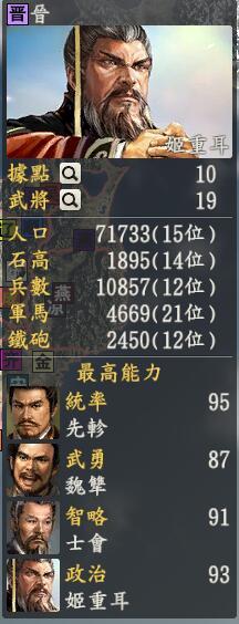君主:姬重耳创造性:中道君主士道:志专属政策:三军六卿晋国的一个政治军事制度啦,而且晋国多数武将都是三家的前身,重耳表示这个政策蛮配的晋国的武将有很多个厉害的,而且在最西南部的地区,左右的前秦和西夏都不是太强大,很快就可以统一然后和北边的秦国一决胜负,当然啦,也可以像历史上一样永结秦晋之好,然后对着东面的吴越开打嘛,不过晋国能打仗的大将不多,也就是先轸(吐口水的那位)比较厉害啦,还有魏犨、韩厥等也不错,主要的武将还是奶爸和种田。