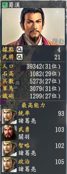 君主:刘备创造性:保守君主士道:义(我的政策就是我的口号)专属政策:兴复汉室,一个大幅度拉拢人心的政策,基本上对于周边我们都能够友好解决,曹操这时候看着刘备。。。喜闻乐见到了众为人熟知的三国时期了,但是这个时期数据根本不好确定,因为它真的是,真的是太!被!人!熟!知!了!所以一切数据都是大概,大概,不讨论具体233刘备占据的地方是和其余几个带有“蜀”字政权在一起的巴蜀(被我YY出来的)地方,这个地方主要的敌人就是来自上面的大秦,但是刘备方面的将领可以说是九州(川蜀)里面质量第二的,五虎将(虽然这个是YY的)都没有给的太吃亏,赵、黄、马是单体的buff,关羽是全体buff,张飞是范围debuff,随便一个都是不错的人才,当然了,最厉害的还是独具三个名额的诸葛亮,主要还是在特技上面非常厉害,另外说个段子,王猛也在这里,他们两个可以在一起打了。文官方面,以法正和庞统为首的两个碾压了其余种田的,包括费祎、蒋琬等人,当然还有个后期的姜维也是不错的人才,就是开局比其余人稍逊一色,要稍微锻炼一下而已。作为这么出名的时期,没有妹子是不行的,至于有什么妹子,玩过12代四海的都知道了。