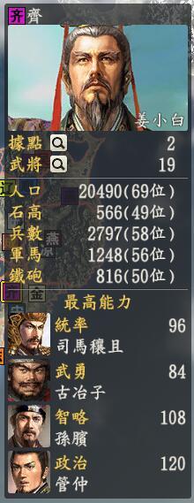 君主:姜小白创造性:中道君主士道:名专属政策:管山海其实就是管仲提出的那套卖盐赚钱的东西,管仲压力巨大因为他已经成为齐国聚焦的目标了姜小白地处势力众多的东部地区,和其余战国的伙伴们离得较远(当然魏国除外),有点小尴尬,他要面对的是南宋汹涌的岳爷爷和北方虽然不咋厉害但是也是个蛮头疼的敌人完颜家,西面还有个蠢蠢欲动的大盗朱温老三,幸好我们的小白老爷爷有几个拿得出手的猛人,第一个就是喜欢玩火的田单,田单的战法朱雀焚天是及其凶猛为数不多的debuff,可能能一把火直接烧地金兀术成了金乌猪,而且本身能力满满嘀,适合做一个独挡一面的大将。第二个就是司马穰苴,虽然这位大叔叔的战法很大众,但是这位叔叔的统率和特技非常优秀,如果让他带上坐轮椅的孙膑,应该和田单一起火烧金兵不是问题。第三位就是孙膑啦,那个坐轮椅的人,虽然也是debuff+高统,可惜就是武力太差了。嗯,肿么差点忘了我们齐国的主角管仲,但是管先生很忙要去种田,十足的奶爸哦~