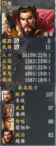 君主:赵雍创造性:创造君主士道:家专属政策:胡服骑射赵雍说这就是我的标志了,看什么看,继续射!赵雍的实力还是非常不错的,除了秦国这个大势力,第二个就要数他自己了,但是这不一定是好事,因为自己就在秦国旁边,赵雍的小心脏还是颤抖的,万一搞不好白起又来了肿么办,难道长平的梦又变成现实了吗?但是没问题,我们的赵雍拥有了几个大神,其中最肉的廉颇都在赵国,有了廉颇,部队的防御呈直线上升,能和这个铁甲抗衡的,估计只有远在唐朝的张巡和南宋的孟珙默默看着了,肉盾廉颇遇到狂魔白起,谁赢还真的说不准呢第二个攻击型的神将就是李牧啦,李牧是一个攻守兼备的单体神将,虽然和别人配合不是太好,但是自己一个人出去消灭那些没用的家伙都不是难事,旁边的两个蜀见到李牧那心里真的哆嗦呀。第三个就是配合型的输出神将赵奢啦,总体实力虽然弱于他们两个,但是赵奢速推的骑兵战法面对秦国的武将时候还不算太弱,也是一个可造的人才当然啦,我们还有个嘴炮大王蔺相如同志以及他手上拿着的那块和氏璧。