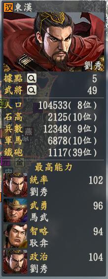君主:刘秀创造性:中道君主士道:道(反正我的血缘)专属政策:推恩令、封狼居胥一个是军团有关的,从汉武帝和主父偃那里偷来的能量球,还有一个名为霍去病,其实这名字我真的很像改。至于你说这个有什么用处,你看看汉朝如何揍织田的就知道了。占据了原版斋藤家位置的刘秀,因为自己拥有许多高素质的人才,完全就是中部地区的霸主之一,虽然承受着来自南面朱元璋和东面李世民的危害,但是自己和祖宗刘邦开局就处于同盟关系,赶紧西进和西汉联合消灭大块地区并且随时补刀唐明就是我们刘秀应该做的事情了。不过刘秀的武将整体而言也不算是最突出的,平均水平都不差而已,云台二十八将基本是集齐了,拿得出手的却只有冯异、耿弇、马武、岑彭几位,其余多数的都是副将的命,当然有一位比较强力的马援是好事。另一方面,文官多数不是特别给力但是女性将领突出优势,有邓绥和班昭两个妹子占据了不错的地位。再有就是后期的段颎、皇甫规等人可以一用。整体来说最厉害的还是刘秀自己一个人。