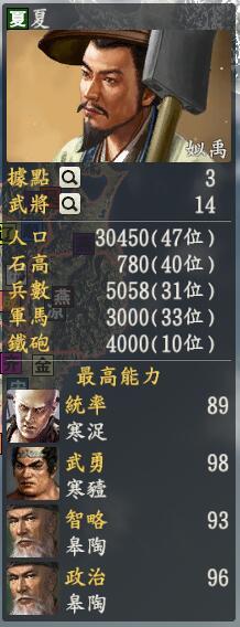 首先是夏朝,这个传闻中第一个朝代的国家。君主:姒禹创造性:保守(种田去吧~)君主士道:名专属政策:九州五服姒禹把天下分为九个州,并开创了五服制度管理各民族,政策也是从这里来总体来说姒禹的人才蛮稀少,和隔壁的商朝不一样,姒禹这边好少战斗人才呀,等下,发现几个叫做寒浊、后羿之类的不错的人,但是人家忠诚很低哦,很容易就会被挖走呢~不过姒禹有一个女艾妹纸用起来挺不错的,亲测时候很喜欢,嗯嗯。