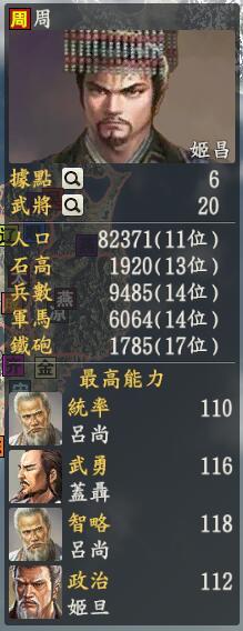 君主:姬昌创造性:中道(咱既要打仗还要搞百家也是个多变的时代啊,八百年呢~)君主士道:道专属政策:封邦建国姬昌同志表示俺的周朝就是厉害,政策真是可以好多方面想不完,开始打算礼乐制度,宗法制度,想想还是封建制度来的好吧,谁叫姬同志就是分封太出名因为姬同志太厉害了,八百年的周朝拆不开,于是西周和东周就合并在一起啦,假如只要西周,那武将真是太少啦,姬昌受不了,但是其实东周的武将也不是很多。。。不过,因为东周有一群人特别喜欢嘴炮,他们就是诸子百家,这群人给战国哪个势力都不好,干脆就归给姬同志好啦,姬同志一看满满的文学家思想家,心里肯定乐开了花于是你会看到周朝好多孔子、孟子、荀子之类的。还有名医扁鹊,死在秦国但还是别给始皇大叔。当然啦,313墨夜君满满的情怀加了个小人物,但是又是大人物的盖聂,嗯,结果他就这样光荣的走上了排行榜~总体来说周朝难度还可以的,就是防止西边疯狂的织田大魔王好了。