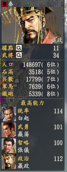 君主:嬴政创造性:创造君主士道:志(赳赳老秦复我河山,歌词应该没有唱错吧)专属政策:郡县制不要问偶为虾米是个内政,因为我觉得我的军事已经够强大了,你得给我玩玩种田嘛嗯嗯,终于到了我们的大boss之一的秦国呢,嬴政已经摆好了pose就等着说一声茄子了。作为仅次于两个日本(我们是客串的)和汉唐宋宋明的第八大势力,嬴政很高兴呀,自己的地盘灰常大,虽然隔壁坐着个和自己有的比的赵国,听说还有什么廉颇李牧,但是我们的嬴政不放在眼里,这不,我们武有蒙恬白起樗里疾王翦等人,文有张仪范雎李斯吕不韦等,打仗还是种田我们都是一流的,没什么可以害怕的,等等,右上角的织田怎么朝我们来了,喂喂喂,说好的新疆不通四川呢话虽如此,我们的嬴政还有个势力专门才有的特技,叫做赳赳老秦,那边的织田早就对着这个咬牙切齿了,什么鬼,为什么我大魔王都木有,只见对面白起才刚打了几座城,统率就立刻飞速上升,织田过去一看,艾玛开挂的吧。我们的白起见到魔王笑笑,你是魔王我是人屠嘛,领着蒙恬和王翦一阵冲击。。。。再看看文臣,张仪那个外交简直可怕,魏冉离间起来不要命,百里奚一个AOE下来对面的特效立刻没了,还有奶爸蹇叔等人,等下,有个叫做赵高的怎么回事,为什么自己人都朝自己打来了,等下等下!最后说说妹子方面,秦国不好萝莉好霸道女总裁,嗯嗯就是酱紫。你们说想要嫪毐?不行!