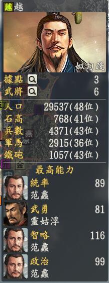 君主:姒勾践创造性:保守君主士道:志专属政策:卧薪尝胆传说中连某些脏东西都敢吃下去的勾践靠着这个发愤图强,成为了好少年如果说苏杭一地什么东西最多,有句话叫做美女嘛,没错,我们的勾践呢也是够贱的,手上握着四大美人之首的西施妹纸还不够,还要再带上一个郑旦妹纸,不过勾践除了妹纸拿得出手,还有一个非常厉害的大商人就做范蠡的,听说厉害起来可以把孙武也击败呢,再有我们的勾践喜欢龟缩在一边,静看天下大势也是蛮不错的。总体武将太少是关键,勾践把目光先盯着隔壁一个小势力叫做南越的,嗯嗯。