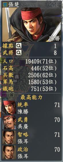 君主:陈胜创造性:创造君主士道:创造(造反就是有理,我可是第一个!【我偷偷地说:然而这并没有什么用耶】)专属政策:揭竿而起大楚兴陈胜王,我喊我喜欢,我喊我造反,我喊我作死什么,你们竟然说我酱油!我可是第一人啊,第一人啊!你管我是不是屌丝逆袭了。但是这没有什么用处,吴广看着陈胜说:陈哥,你说我们势力有啥人。陈胜说:管他呢,谁要来都欢迎于是陈胜轰轰烈烈领着一堆杂牌军加进来了,等我看看,什么吕臣周文就算了,还算是自己的哥们,但是武臣周市这些你和我说什么鬼。陈胜暴跳如雷:项羽呢?刘邦呢?彭越呢?为嘛不把他们算进去吴广捏了一把汗说:你以为他们会来吗,我的哥。。。于是我看陈胜太惨了就给你和吴广一个光环数据吧。你们不要以为陈胜能凑够人就很好哦,其实那群家伙,嘿嘿,暗地里不服滴,我估计等下项羽和刘邦就挖走了。陈胜拍桌子大怒:哥们,我们揍瓦岗去!唉,本是同根生,相煎何太急啊~