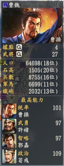 君主:曹操创造性:创造君主士道:才(因为唯才是举吗?嗯,曹操沉思一下突然觉得自己萌萌哒,这就变成才了。)专属政策:屯田制,曹大人,剧本都是这么要求的,果然还是吃饭好。曹操势力要说可了不得,他可是从原来的织田信长势力改过来的,再次拥入怀抱叹息道:人生何其相似啊,虽然这是暗荣你给我们加上的因缘。而且暗荣做割草的时候总喜欢把孙坚他们做成成长奋斗史,但是我们的曹操明显更符合这个要求,打开人物列表往下一看基本上全都是一门,这个可是好事啊,要知道有两个特技就是和一门有关的。所以我们的曹操势力有夏侯渊这个弓兵输出,乐进的拆栅栏(立志传以后就是拆城门了),曹仁的肉盾,张辽的单体buff,荀彧的奶,郭嘉程昱的debuff,基本啥都有了,就等着什么时候和刘秀逐鹿中原了,当然啦,南方的朱元璋和东面的李世民一直是存在的巨大威胁。