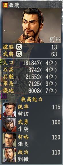 君主:刘邦创造性:中道君主士道:才(察举制没办法做政策了,我还是换到这个意思上面吧,谁叫我刘邦就是厉害,政策真多)专属政策:推恩令、封狼居胥一个是军团有关的,从汉武帝和主父偃那里偷来的能量球,还有一个名为霍去病,其实这名字我真的很像改。至于你说这个有什么用处,你看看汉朝如何揍织田的就知道了。四大boss之一的刘邦很高兴和大家见面了,作为雄踞于四国(湖南江西)的老大来说,周围的小弟根本不放在眼里,即使吴越有孙武和范蠡又咋了,即使霸王就在自己旁边又怎么了,自己还不是想揍谁就去揍谁,这使得刘邦非常高兴,何况自己的东面还有一位远方亲戚叫做刘秀的在遥相呼应,帮自己拖延明朝和日本的进攻,刘邦那个开心啊,虽然上面的织田很疯狂,但是自己也不老。说起来刘邦的人才,那真是多得数不完了,我们分开朝代来说,首先是开国那几个出色的代表人物,很厉害的韩信,很厉害的张良,很厉害的萧何(后勤部长?),很厉害的陈平,为啥这么多很厉害,因为他真的比较不错的,特性基本都是十多个,一打仗开始各种爆特性,什么军神百战青龙出海一堆上去,就是织田也得哭。当然了,还有樊哙灌婴周勃老司机夏侯婴等等副将为辅,刘邦仅仅带着开国的武将都很高兴了。但是这还没完哦接下来就是文帝景帝时期,这个时期主要是文官,那群和诸侯各种瞎掰的文人比如晁错袁盎之类的都有都有。武帝时期又是一个堆积变态武将的时候,霍去病+卫青+李广号称三大恶心,还没有算上李陵韩安国之类的,文人又有汲黯桑弘羊等人,虽然战法不咋地好歹种田是不错的。这群武将加上开国的基本构成了西汉的总体武将素质。当然,第四个时期主要是汉宣帝刘询时期的,以麒麟阁为首的以及后来几位君主时期的陈汤等等武将,这些武将虽然不及上述的几位,但是作为二流武将都有着不错的副将发挥。最后还有两个在野的人物,他们的名字应该和新朝有关,嗯嗯当然别忘了还有个mod重点推荐的人物叫做王昭君的,嘿嘿,谁用谁知道。