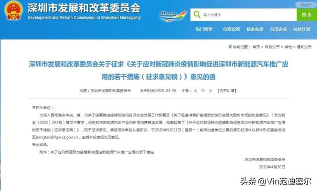 4月30日,深圳市发展和改革委员会官网发布《关于应对新冠肺炎疫情影响促进深圳市新能源汽车推广应用的若干措施(征求意见稿)》,面向社会征求意见,征求意见期至2020年5月11日。