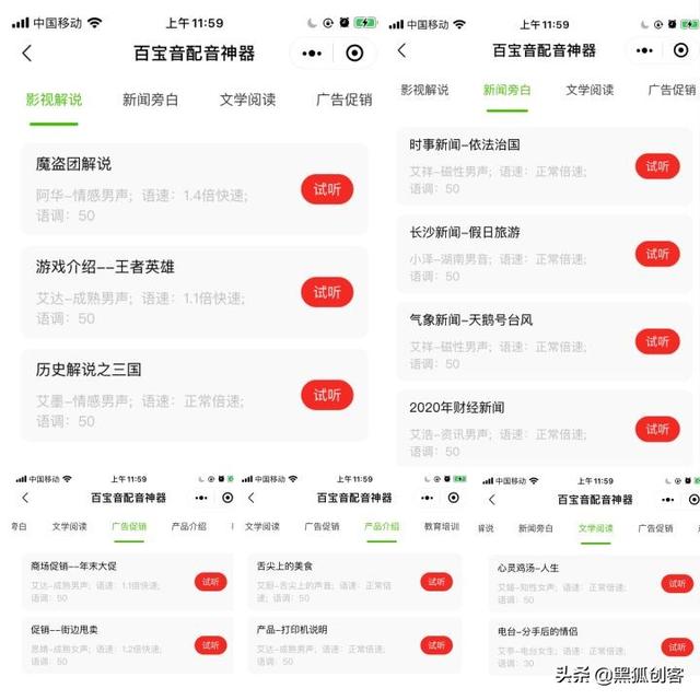 一些是自己录的,一些是用文字转语音工具合成的,可以试试这个,100多个朗读员,声音效果不错,可以试试: