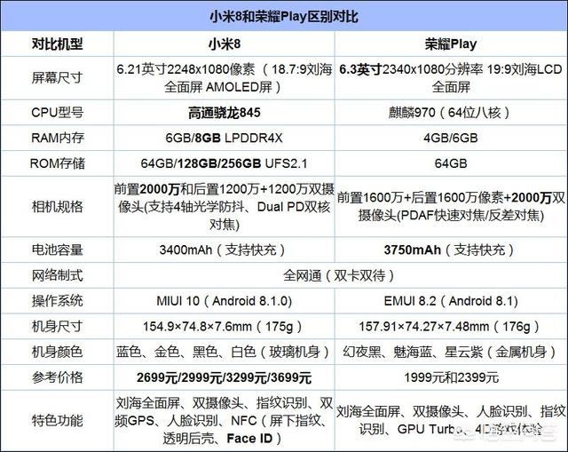 综合手机的配置考虑,小米8的硬件用料会更足。带给你的是,这个价位买到这样的手机,绝对不亏的感觉。而荣耀play给我们的是,比较出色的价格,能买到一个玩游戏不错的手机。
