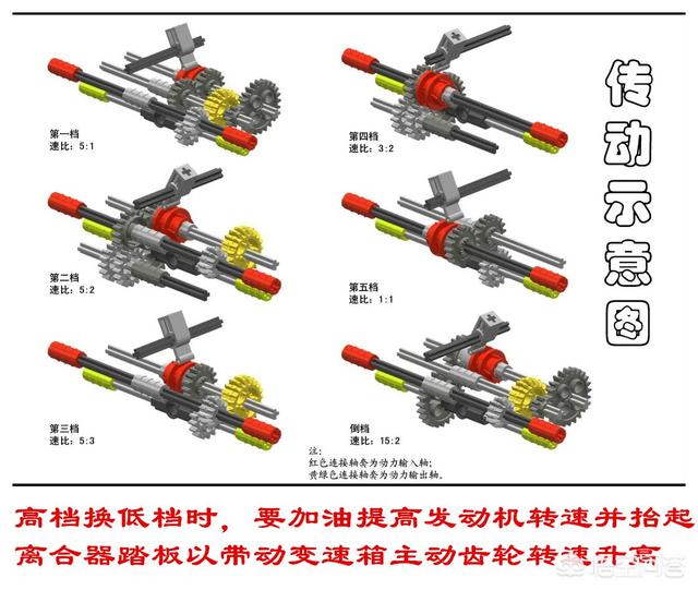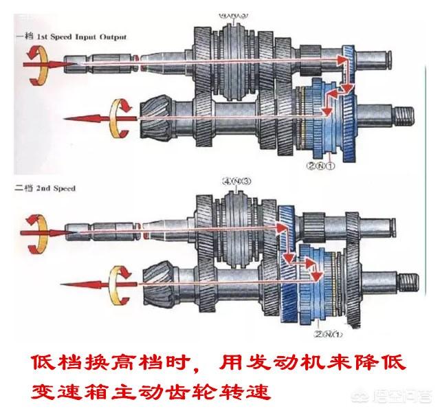 同样的道理,高挡降低挡时,一般都是在发动机转速比较低、车速比较高的情况下;降到更低的档位后,在车速不变的情况下,发动机转速会升高。这时候我们松开油门,踩下离合器踏板,变速箱与发动机断开连接,此时发动机处于怠速状态;而变速箱内部的齿轮在汽车惯性作用下还在高速运转,此时待啮合的主动齿轮转速低,被动齿轮转速高,二者无法平顺的啮合。此时如果我们抬起离合器踏板,同时加一脚油门,发动机转速就会迅速升高,变速箱的一轴在发动机的带动下,转速也随之升高,同时变速箱中间轴和输出轴上的主动齿轮在一轴的带动下也随之升高,与输出轴上的被动齿轮转速接近或相同,这样二者就可以顺利的啮合了。