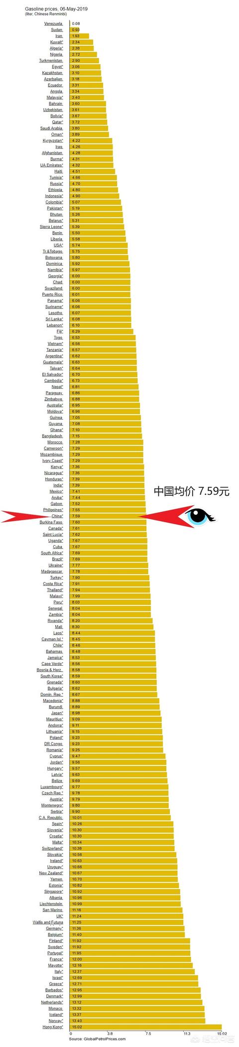 在回答成品油价格之前,我们先看一组数据。该数据来源于GlobalPetrolPrices.com,大家有兴趣可以自己去该网站看一下。数据主要以汽油为样本,统计的全球有记录的所有国家汽油的平均价格(各种标号的汽油),单位为:元/升,货币已经经过了换算,统计时间2019年5月6号(图片很长,重点看箭头所指中国价格)。