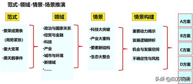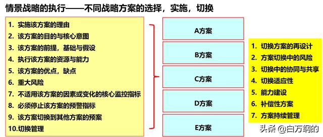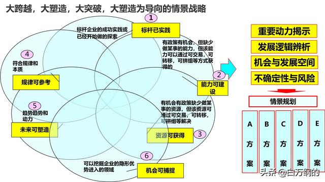 五,只有领导人确定的未来情景,并为此做出战略方案A方案B方案C方案D方案E部署,有时甚至要安排花费巨大的风险预案(比如华为前置十二年的备胎方案),并为此做出相应的内部说服与动员,形成多个战略方案,预算,组织准备,能力准备等等,这种假设全才有意义。