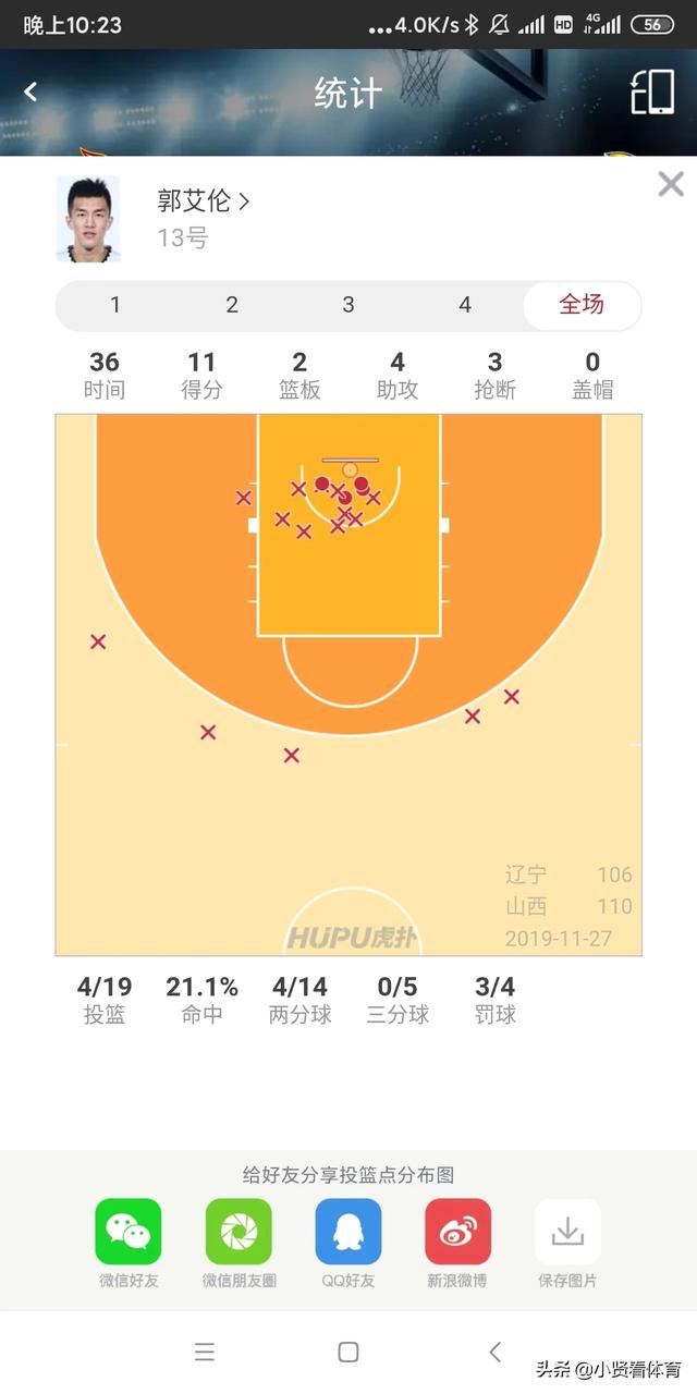 今天晚上辽宁又输球了,这场比赛也是结束了辽宁进来的三连胜,他们以106:110输给了山西队,在这一场比赛当中,辽宁的核心球员郭艾伦上场36分钟拿下11分,两个篮板四个助攻,但是整场比赛郭艾伦出手了19次,仅仅投中四个球。在这场比赛里面,郭艾伦三分球五次出手,一个都没有投进。郭艾伦的状态非常糟糕。
