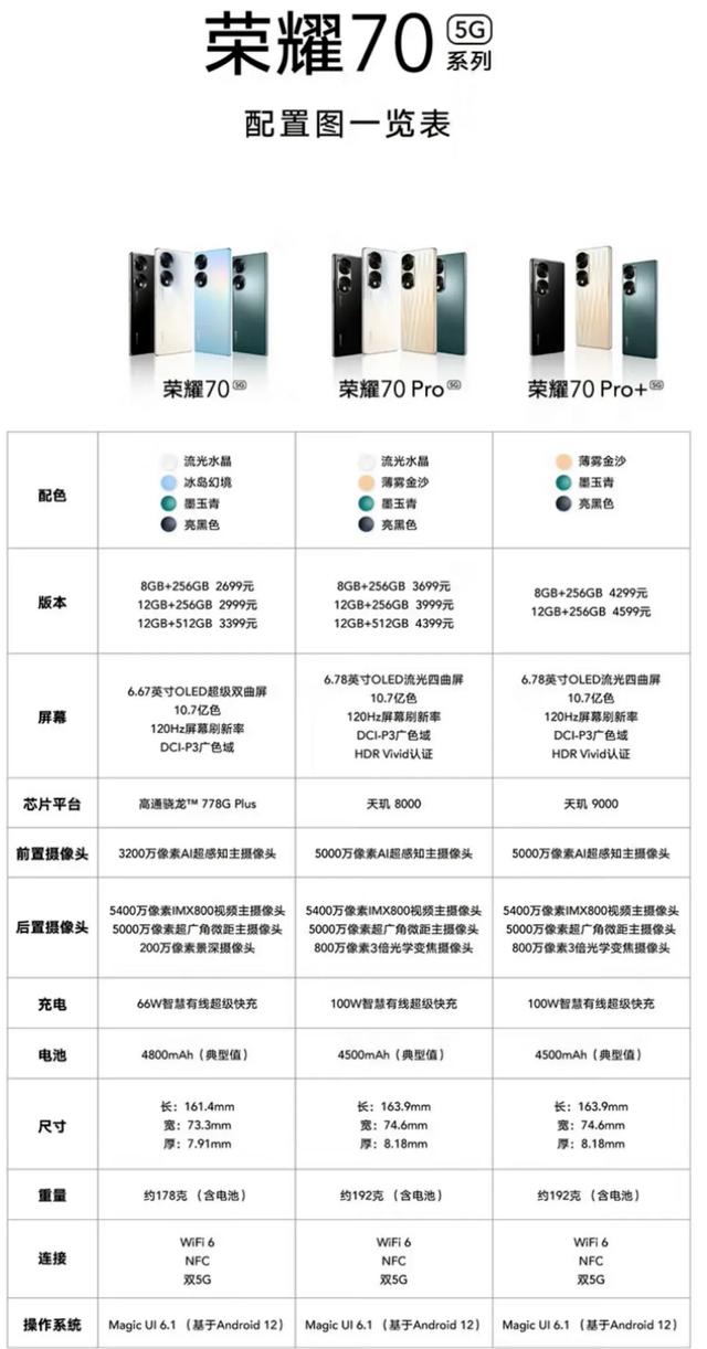 荣耀70pro屏幕尺寸为6.78英寸OLED流光四曲屏,有120Hz刷新率,DCI-P3广色域,搭载天玑8000处理器+LPDDR5+UFS3.1,在安兔兔跑分方面荣耀70Pro的安兔兔跑分为70W+;