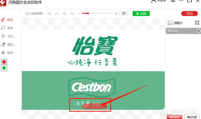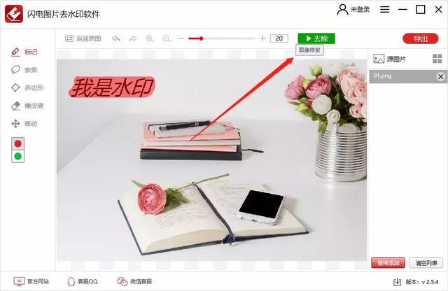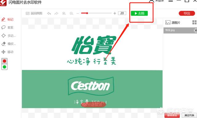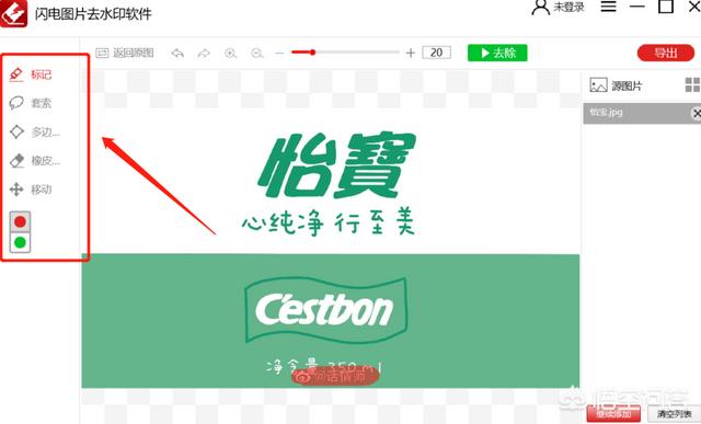 第二步、添加图片后,在软件的左侧可选择需要用到的工具。根据图片的不同选择标记、套索、多边形、橡皮擦等不同的工具修改去除水印。图中的红色区域是移除区,绿色是参考区。
