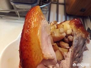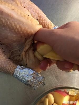 用锡纸包住鸡翅尖和腿骨尖以免烤糊,苹果坚果蔓越莓塞满鸡肚子