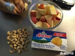 三黄鸡一只(公鸡)苹果一到两个腰果或者是核桃适量蔓越莓或者葡萄干适量食盐一平勺清水适量蚝油三大勺(汤匙)黄油适量老抽两大勺(汤匙)蜂蜜三大勺黑胡椒两大勺