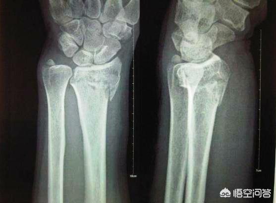 骨折后拍CT,还是DR平片是要看骨折的具体情况的,如果是容易恢复的部位,并且骨折情况比较单一的,通过手法复位就可以了,一般拍平片就可以,下图就是一个典型的克雷士骨折,也就是桡骨远端骨折的平片: