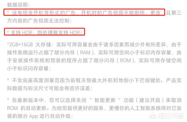 先肯定这个价位吸引人的基础下,红米电视还是含广告的,这个和小米一贯的路子一样,当然详情页也标注了,并没有隐瞒,其次特意标明了处理器支持HDR,也就是屏幕不支持,想要玩PS4的朋友们就不用考虑这款了,一分钱一分货。