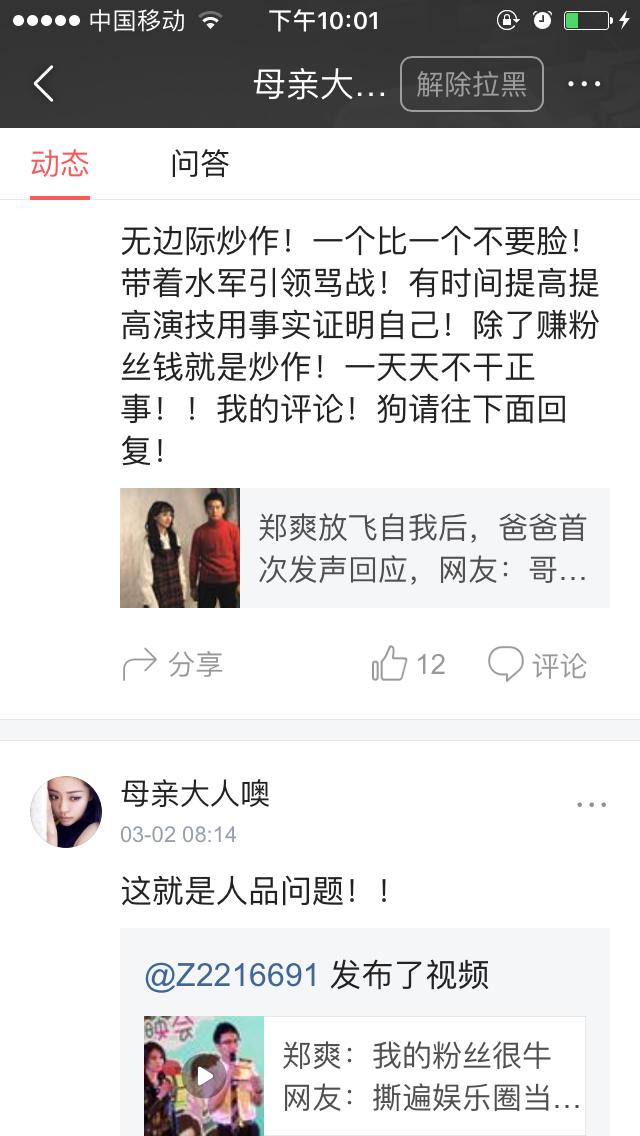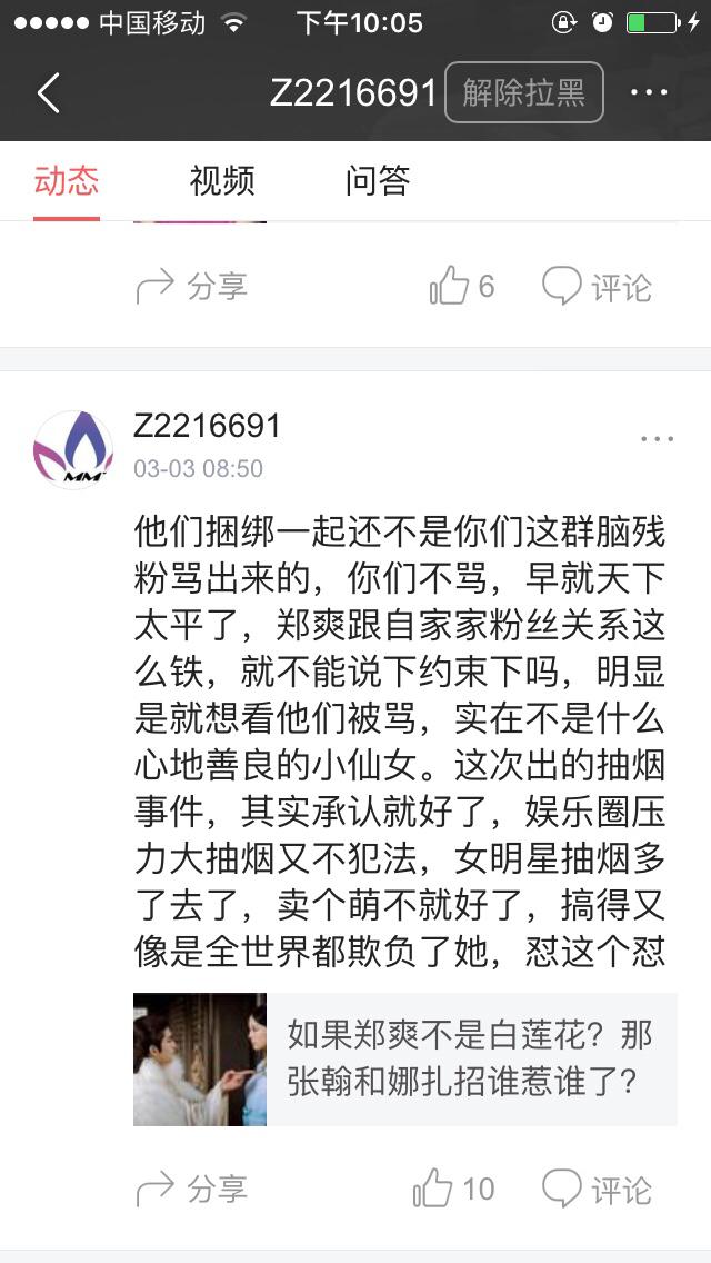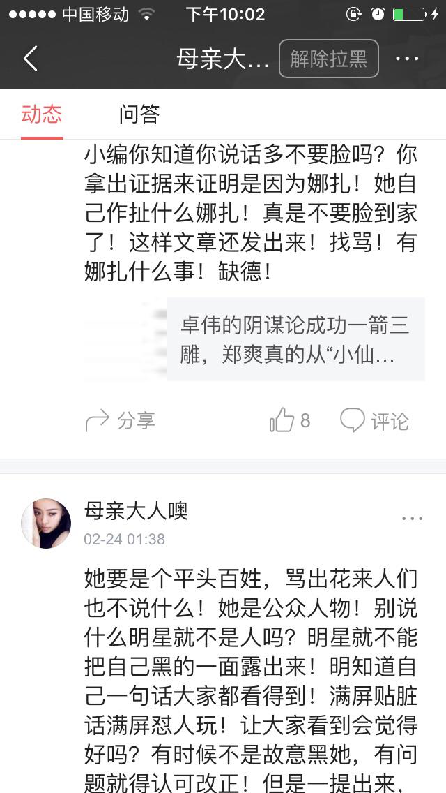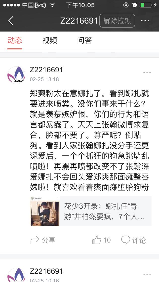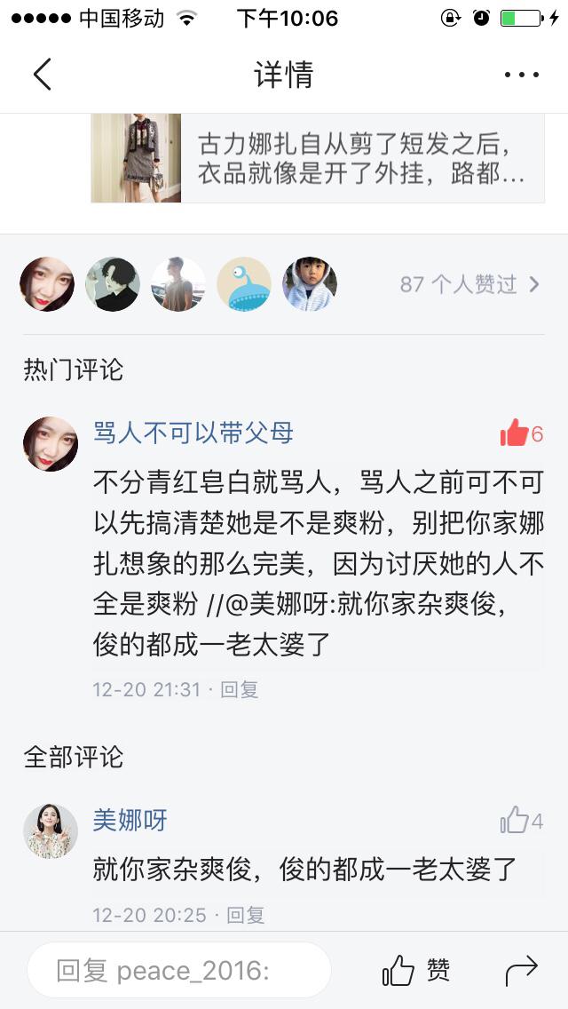 似乎有娜扎的粉丝有个规律,就是一有路人骂娜扎就偏缠着她骂某爽的脑残粉,还是越喷越自大,跟她说古丽娜扎的一些不好的性格,人家硬是听不下去,直接狗啊!脑残啊!什么难听的话都肯说,似乎就认为她家爱豆是娱乐圈唯一的女的,多漂亮哦,她家爱豆就是无辜,都怪某爽,娜扎就是完美无瑕,到现在某爽放开性格,被黑发辱骂时,娜扎粉丝还在说什么活该!呐,娜扎粉丝听着,娜扎真的很做作!不服的话,来喷啊!我就那么自信娜扎不是一颗好葱