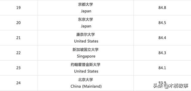亚洲排名最高的为京都大学,第19名,东京大学紧随其后第20名。新加坡国立大学第二十二,北京大学第二十四。