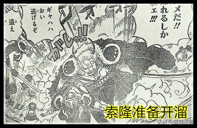 索隆一边抱着昏厥的路飞,一下子侧身飞驰,旁边的人造恶魔果实能力者们开心不已,因为索隆开始开溜。