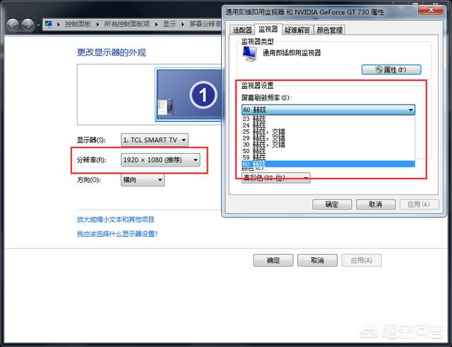 显示的分辨率越高,显示的越细腻,显示区域越大。刷新频率越高,显示的画面越稳定,不会出现画面抖动的效果。