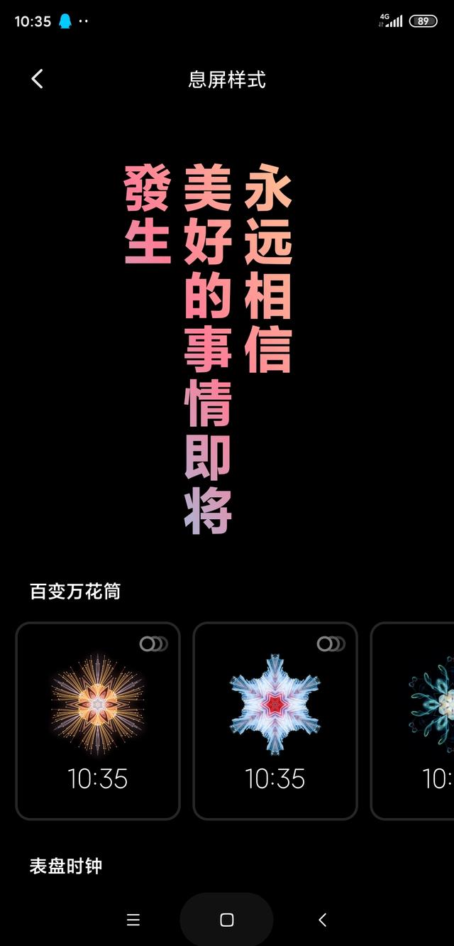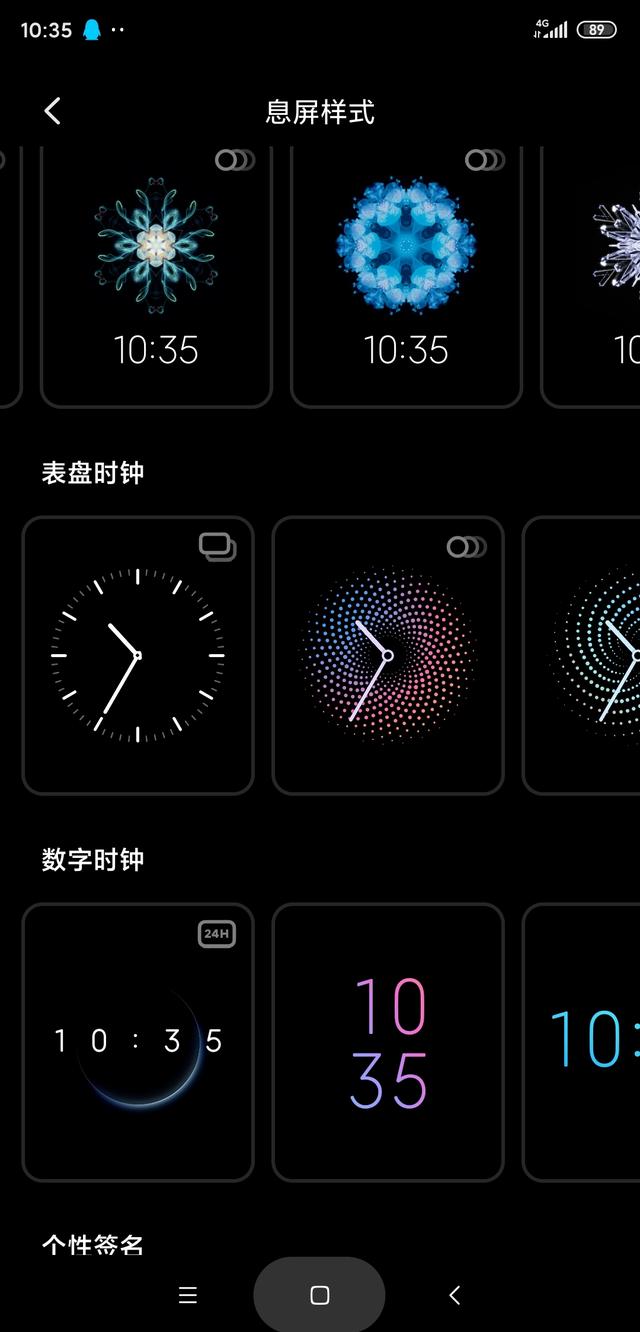 MIUI 11的万象息屏,在原有的时钟基础上,增加了万花筒团,自定义息屏签名等。