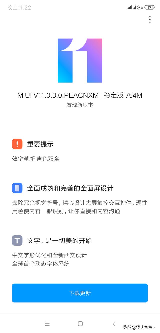 - 考虑到开发难度问题,因为所适配机型多,如果全部升级为安卓10,那么难度比较大,所以从这个角度,小米为了能够让用户提前适配,所以先使用安卓9,进行升级,这就是为什么你看到的MIUI11稳定版可能只有754M的原因。