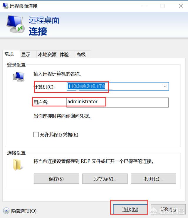步骤2: 在弹出界面输入目的端电脑/主机IP地址,用户名信息,windows默认用户一般为administrator,自定义的用户根据实际情况输入。输入完毕后点击下方连接按钮