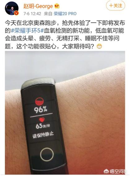 目前,荣耀手环5已知的信息就是荣耀总裁赵明在微博上爆料了关于最新的荣耀手环5的血氧监测新功能体验,这项功能对于爱运动的人群来说,是一个更好的选择。