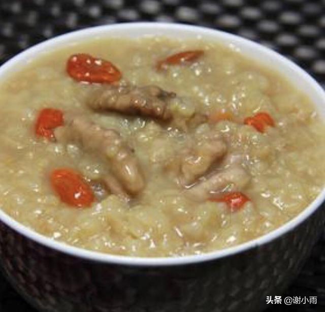 1.洗净枸杞子,梗米,并捣碎核桃仁。2将枸杞子,核桃仁放入砂锅中,加清水适量。3、用旺火烧开后改文火煮30分钟。4然后加入梗米,继续用文火煮粥。