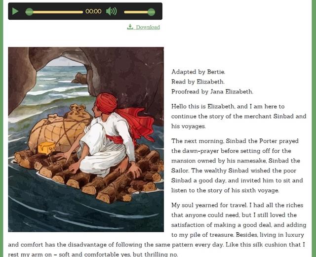 直接点播放按钮就可以在线聆听,下方的Download一点就可以下载。每篇有声书都有在线英文文本配套。短小精悍。插图艺术性很强。