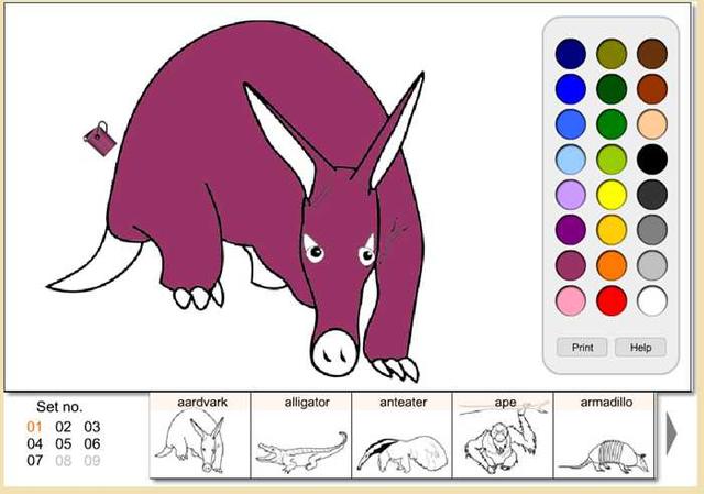 更绝的是,该网站提供了诸如以上23个门类的关键生词的涂色卡。既可以打印出来涂色,又可以在线用电脑涂色。可以在轻松的娱乐中熟悉单词的拼写。课堂和家中均可使用。