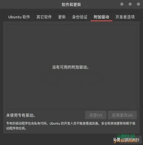 七、启用专有驱动程序 在 Ubuntu 系统中为特殊硬件安装和启用专有驱动程序可以大大提高 Ubuntu 计算机的性能,您可以搜索打开软件和更新——在附加驱动选项卡中为显卡等硬件启用专有驱动程序。