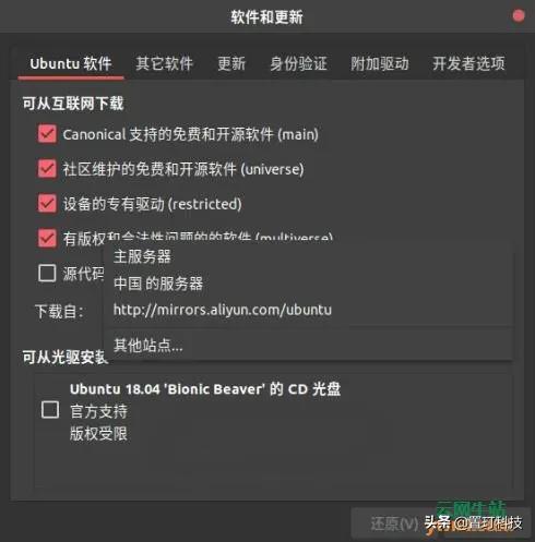 四、设置软件更新镜像 无论网速是否畅快,确保 Ubuntu 从最佳服务器获取更新始终是一个好习惯。 您可以搜索打开软件和更新——选择Ubuntu 软件选项卡——在下载自…中选择一个最适合您的软件源。 国内用户建议选择阿里云(Aliyun)或中国科学技术大学(USTC)的更新源镜像。