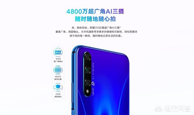 后置摄像头上,荣耀 20S使用了4800万主摄+800万超广角+200万微距的三摄方案。其中主摄有F1.8大光圈。超广角有等效焦距小于24mm的镜头,取景面积扩大了一倍。独立微距镜头拍摄距离4cm左右,丰富了拍照的使用场景。在视频录制方面,都支持视频美颜功能。可以直接用超广角进行录制,支持10级美颜。另外,荣耀20S适配AIS手持超级夜景算法,在夜景拍摄的时候多帧合成照片,保证画面的亮度和细节质量,无需单反,手持手机就能轻松拍出夜景大片