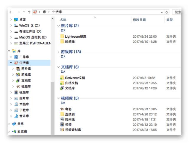 「库」更像是一个「文件夹的集合」,你可以将同类型的文件夹归类在一起,并且在同一个界面中访问所有文件夹中的文件(普通文件夹只能一个一个打开查看),这也保证了硬盘中的文件不会混杂。